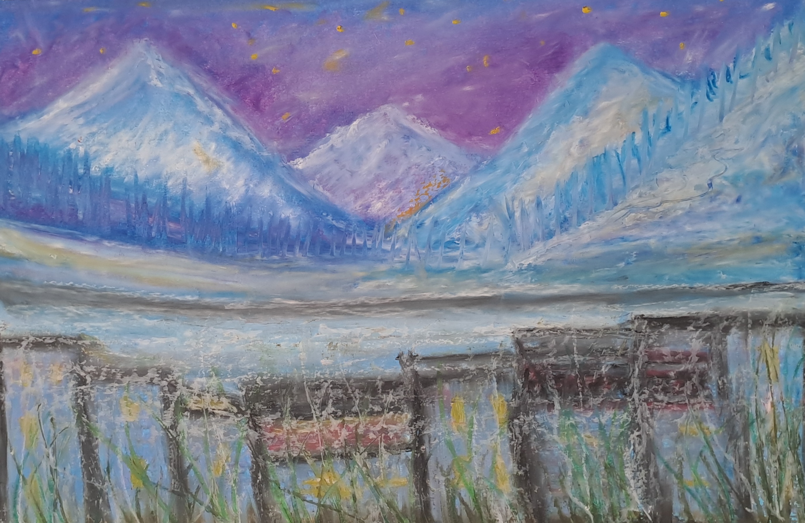 Title: Thawing Boundaries Artist: Laura Bernardeschi Nelson Medium: Oil pastels on paper Size: 45 × 35 cm Year: 2025 Framed: Yes Varnished: Yes Signed: Yes (front and back) Condition: Excellent Description: Thawing Boundaries evokes a landscape caught between winter’s stillness and the slow pulse of renewal. A fragile fence emerges from melting ground, its structure softened by time and shifting temperatures. Beyond it, snow-laden mountains and a violet sky shimmer in the light of change — a world both fading and reforming. Through layered oil pastels and translucent varnish, Laura Bernardeschi Nelson captures the emotional resonance of a planet in flux. The work reflects on the delicate thresholds between nature and humanity, permanence and impermanence — where the ice recedes and life quietly returns. This textured, atmospheric piece continues Nelson’s exploration of climate change, ecological awareness, and the human imprint on fragile environments. Framed and ready to hang.
