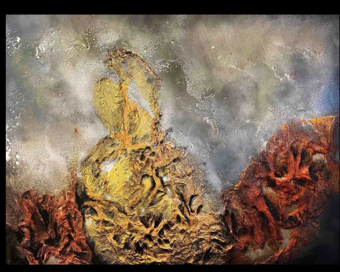 In this textured composition, earthy tones of gold and rust rise from a dense, storm-like background. The surface breathes with layers of matter that seem to melt, fuse, and reawaken — as if the ground itself were remembering a forgotten form. The golden figure at the center emerges like a spirit of renewal, caught between decay and rebirth. Through the interplay of rough texture and soft mist, the painting evokes the eternal dialogue between the earth and the soul — between what sinks and what ascends.
