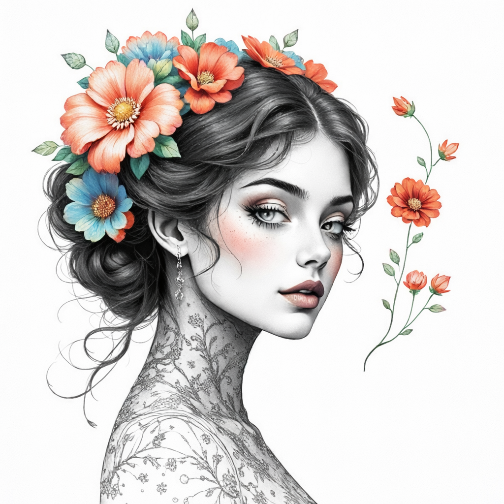 A gentle portrait of a woman adorned with blooming flowers. Soft colors and delicate lines blend harmoniously, capturing elegance, purity, and timeless beauty.