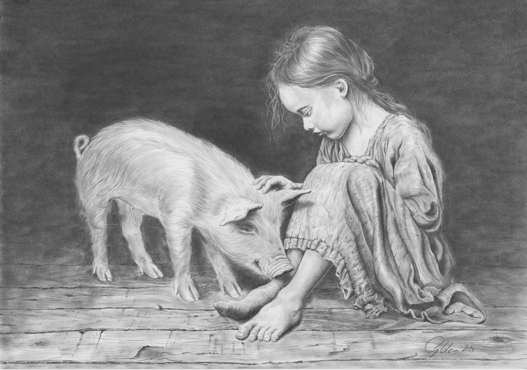 My latest pencil drawing (A4) is a study of closeness and contrast. Amidst a deep, graphite-filled background, a little girl and a piglet meet on old wooden floorboards. It was important to me to create a protective atmosphere through the play of shadows, focusing entirely on the loving touch and the silent bond. A moment of security that needs no words.