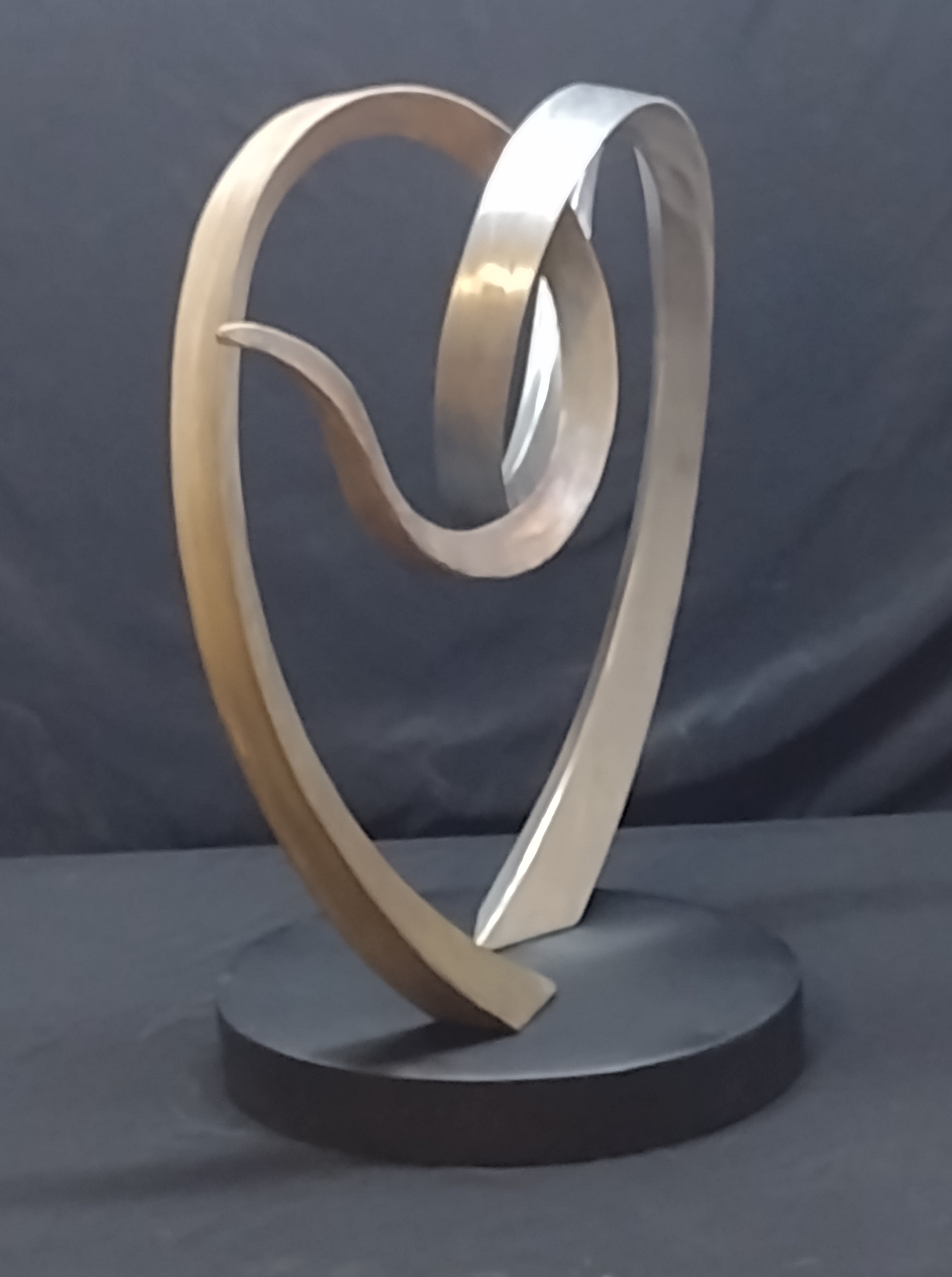 Silicone Bronze, Stainless Steel, Steel base, 23"H X 28"W X14"D. Constructed triangular tube design, welded together, contrasting metals