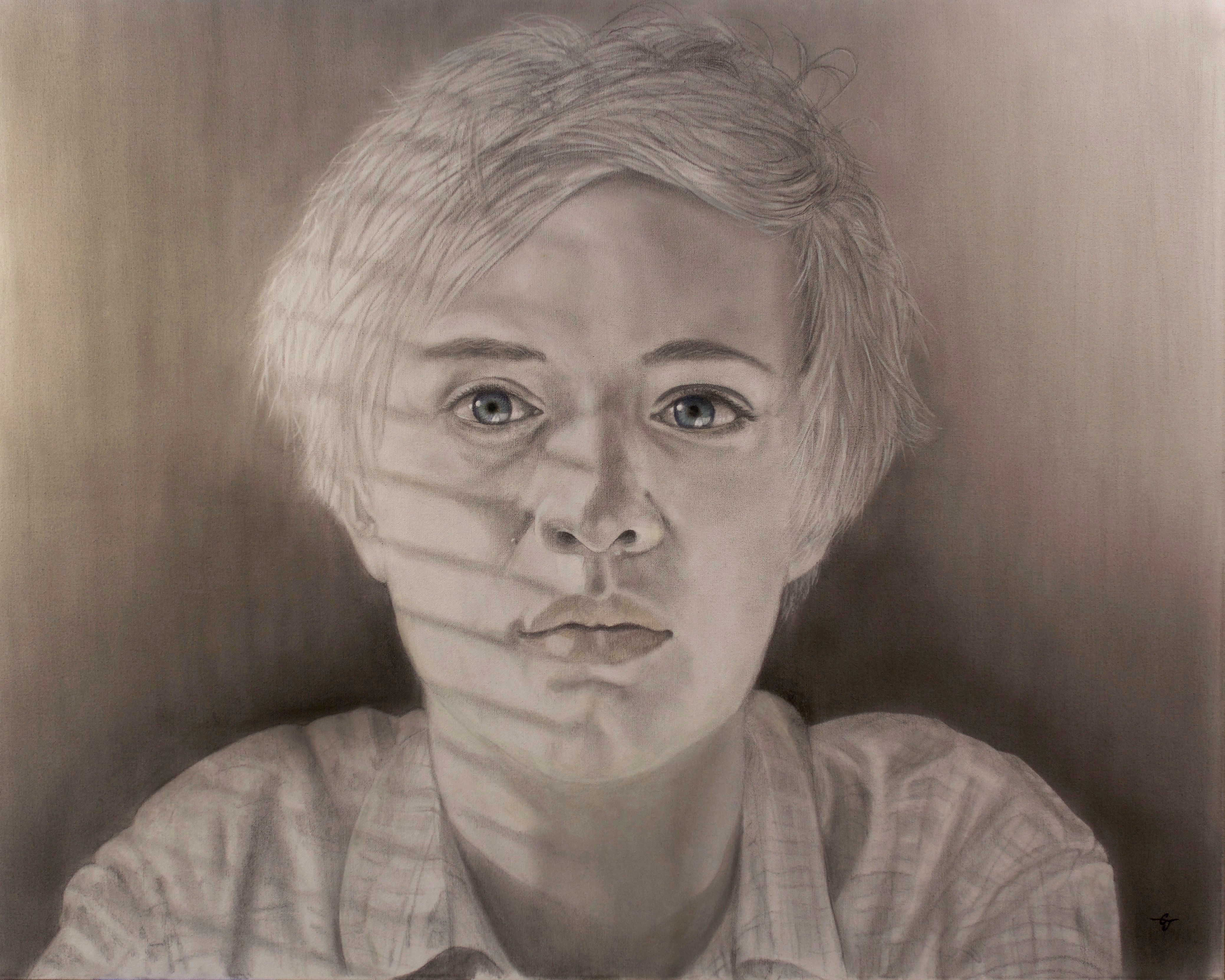 Adrian is my second son, here 14, just entering puberty. Done in acrylics with charcoal and graphite powder.