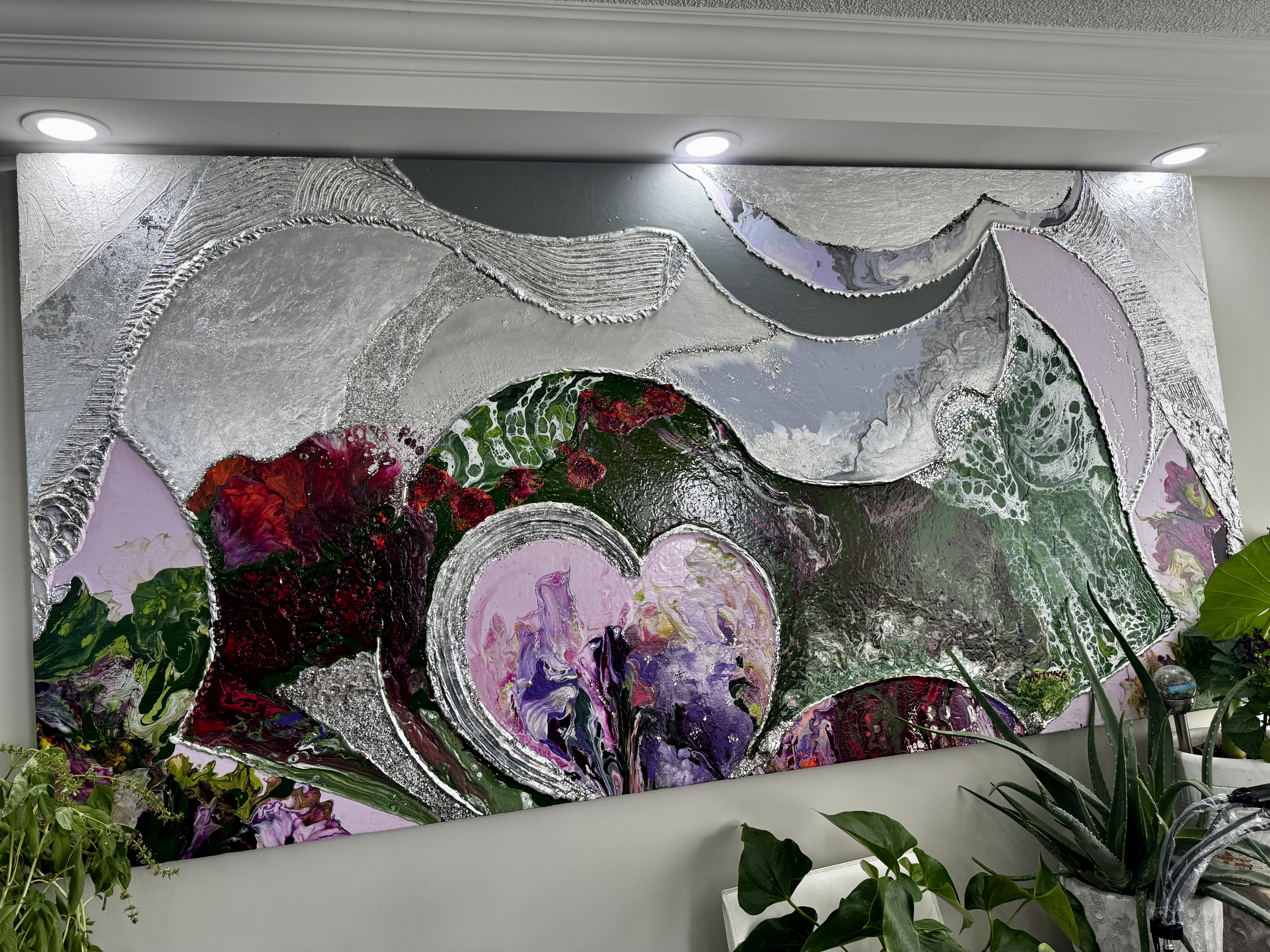 Built on plywood with molding plaster, and painted with Heavy Body Acrylic mixed with Liquitex and other pouring mediums, as well as Golden paints, this work merges structure with intimacy. The focal point is a loving heart in the bottom left, surrounded by layers of nature, day and night, and illuminated by silver metal sheets carefully applied to specific areas. Poured color fills the remaining sections. The painting embodies the essence of life: love as the foundation for growth, focus, and inspiration. It serves as a reminder to embrace meaningful moments, nurture relationships, and reconnect with positivity. Through its composition and light, the work is a reminder of how love empowers us to be our best selves and to inspire others.