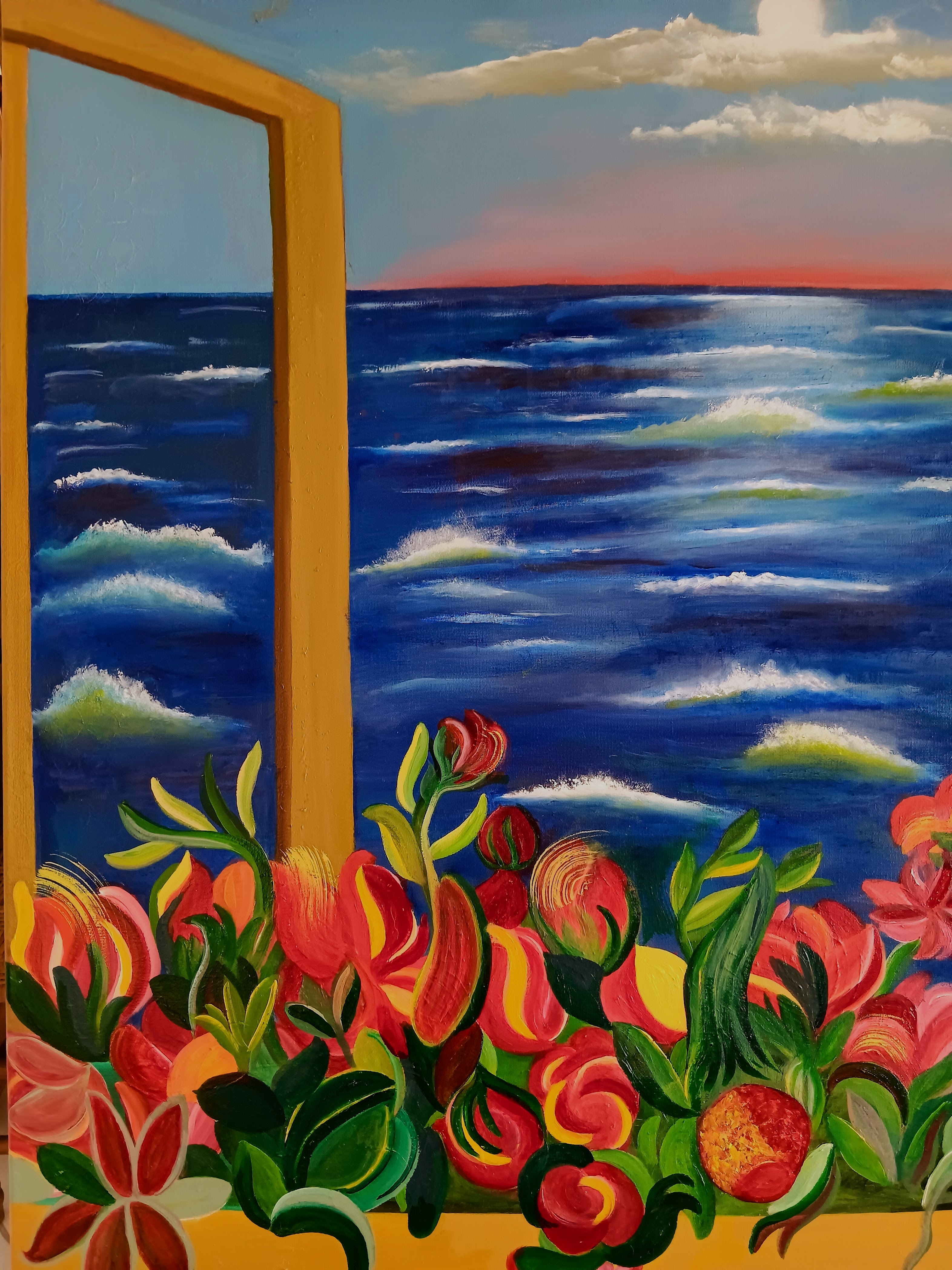 Full Moon at sea 70.0 x 50.0 cmThe open window lets the sea breeze in. Lush, colourful flowers in the foreground contrast with the vivid hues and calming blues of a tranquil sea. .. gentle waves shimmer under the last rays of the setting sun.
