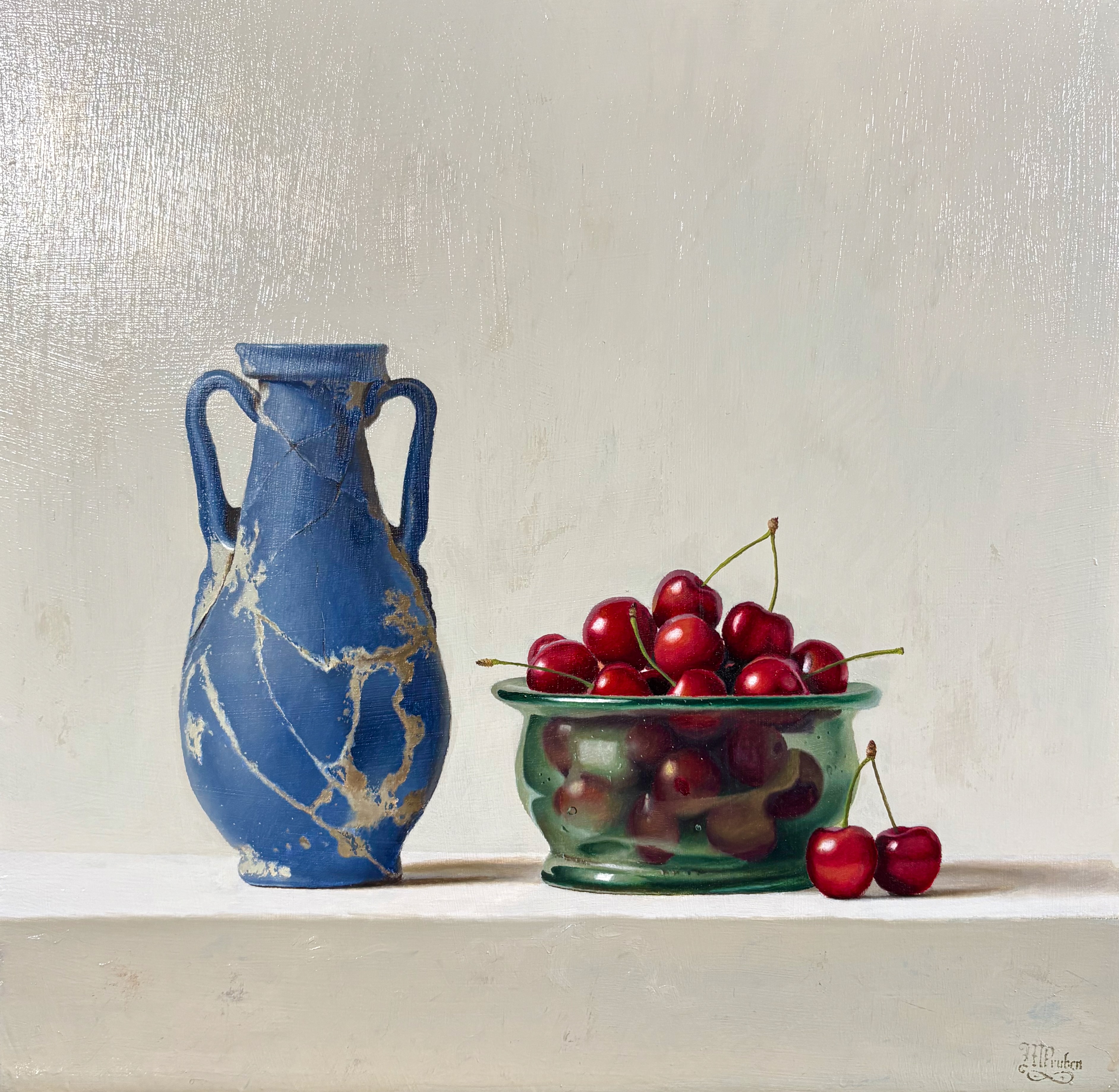 A balanced still life of color and form. The worn blue vessel contrasts with fresh cherries, highlighting texture, light, and the quiet tension between age and vitality.