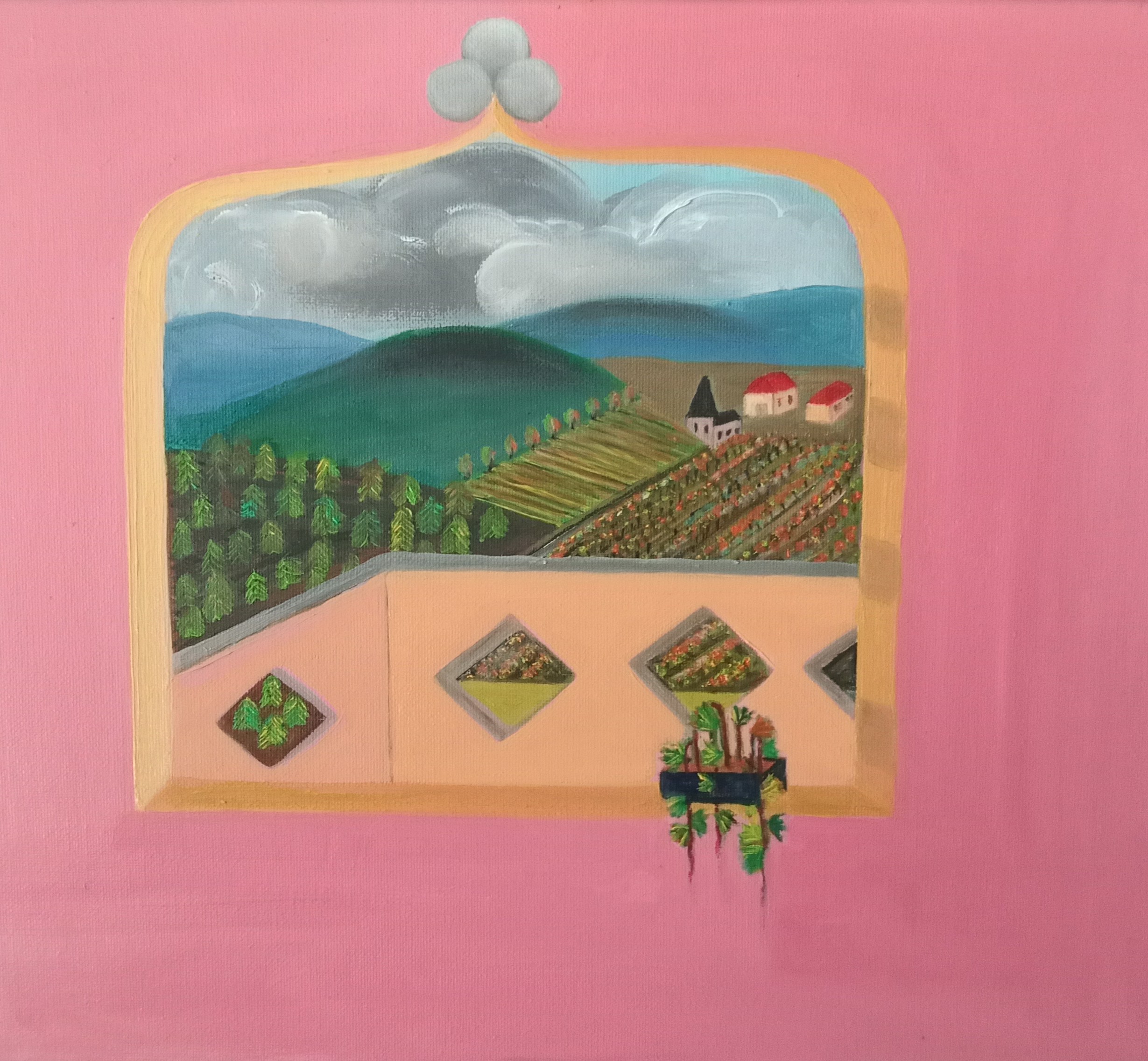 Autumn Grumblings 41.0 x 32.0 cmFramed by a whimsical window, "Autumn Grumblings" captures the shifting spirit of the season. Beyond the soft pink sandstone wall, vineyards blaze with the last colors of fall, while distant hills and brooding clouds hint at change in the air. The cosy interior with its potted plants offerts comforts as autumn's winds begin to stir. I hope this painting invites you to pause, reflect, and find beauty in the gentle unrest of the turning year