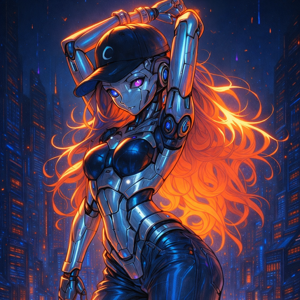 A futuristic portrait blending cybernetic precision with human emotion. Her glowing orange hair burns like a living flame against the deep neon cityscape, symbolizing individuality and spirit within a mechanized world. The detailed metallic body reflects both strength and vulnerability, capturing the tension between technology and humanity. This artwork embodies a vibrant fusion of cyberpunk energy, expressive color, and the timeless allure of a powerful feminine presence.