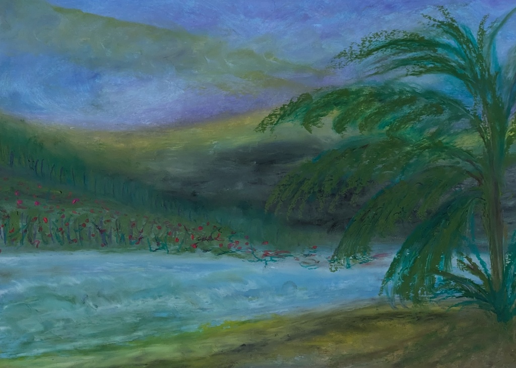 When the Land Breathes Slowly is an oil pastel work on paper that explores a calm, suspended landscape shaped by water, vegetation, and shifting atmosphere. A palm tree anchors the composition, its soft, sweeping forms responding to the surrounding environment rather than dominating it. The scene unfolds quietly, suggesting a place that exists between memory and observation. The palette moves through layered greens, blues, and muted violets, creating a sense of slow movement across land and water. The relationship between river, vegetation, and sky evokes balance and continuity, while subtle tonal shifts suggest change over time. Rather than representing a specific location, the work functions as an emotional landscape, inviting reflection and stillness. Oil pastels allow for a tactile, expressive surface where colour remains active and layered. The visible marks and blended areas reflect an intuitive process that mirrors natural rhythms of growth, erosion, and renewal. The work forms part of an ongoing exploration of landscapes as living systems, shaped by time, atmosphere, and environmental sensitivity. Details Year: 2026 Medium: Oil pastels on paper Dimensions: 45 × 35 cm (framed) Framing: Framed Signature: Signed Condition: Excellent