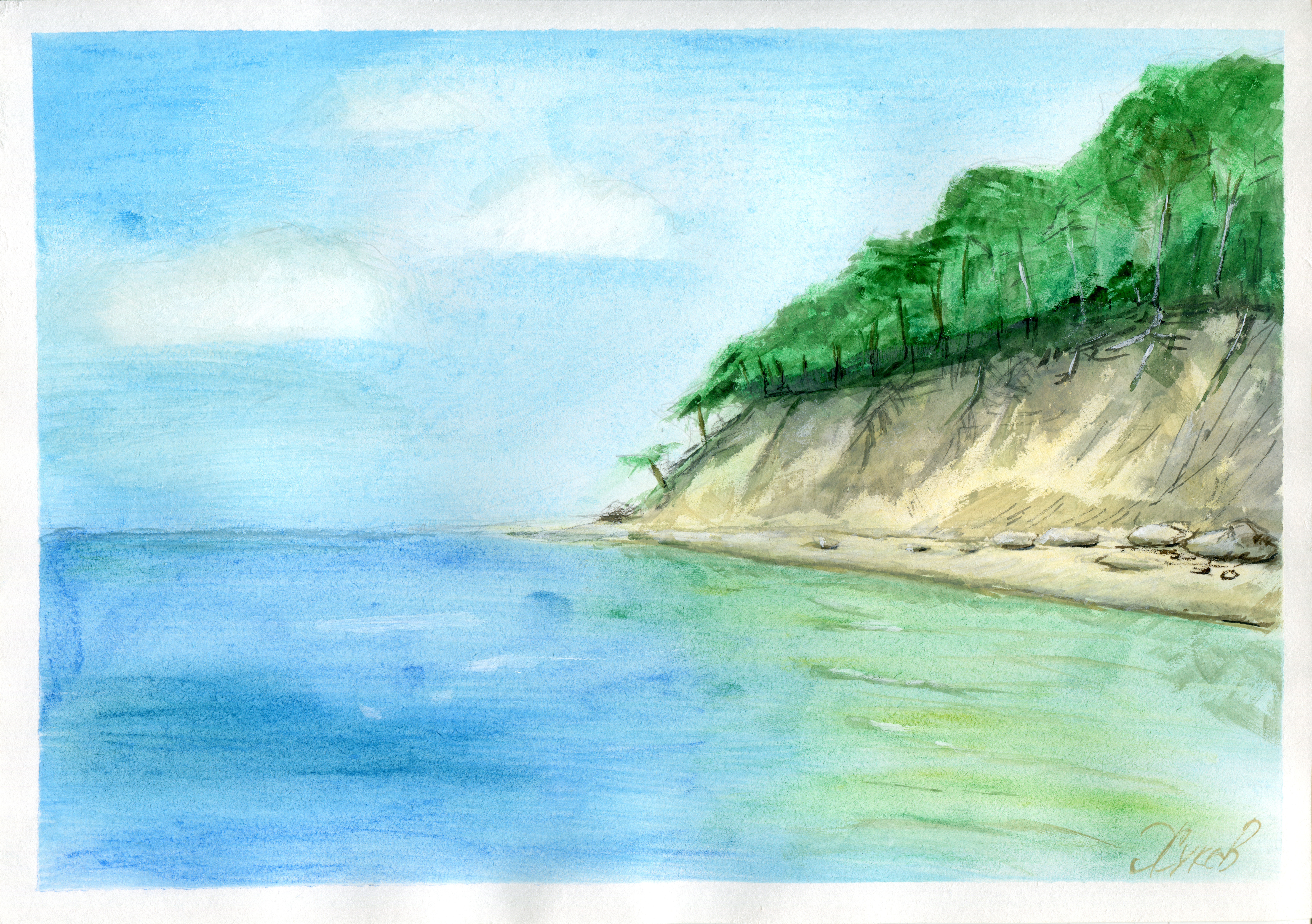 A watercolor study of the Baltic Sea coast, capturing the raw cliffs, shifting light, and austere atmosphere of Cape Taran. The focus is on the interaction between sea, sky, and land, and the sense of constant movement shaped by wind and weather.