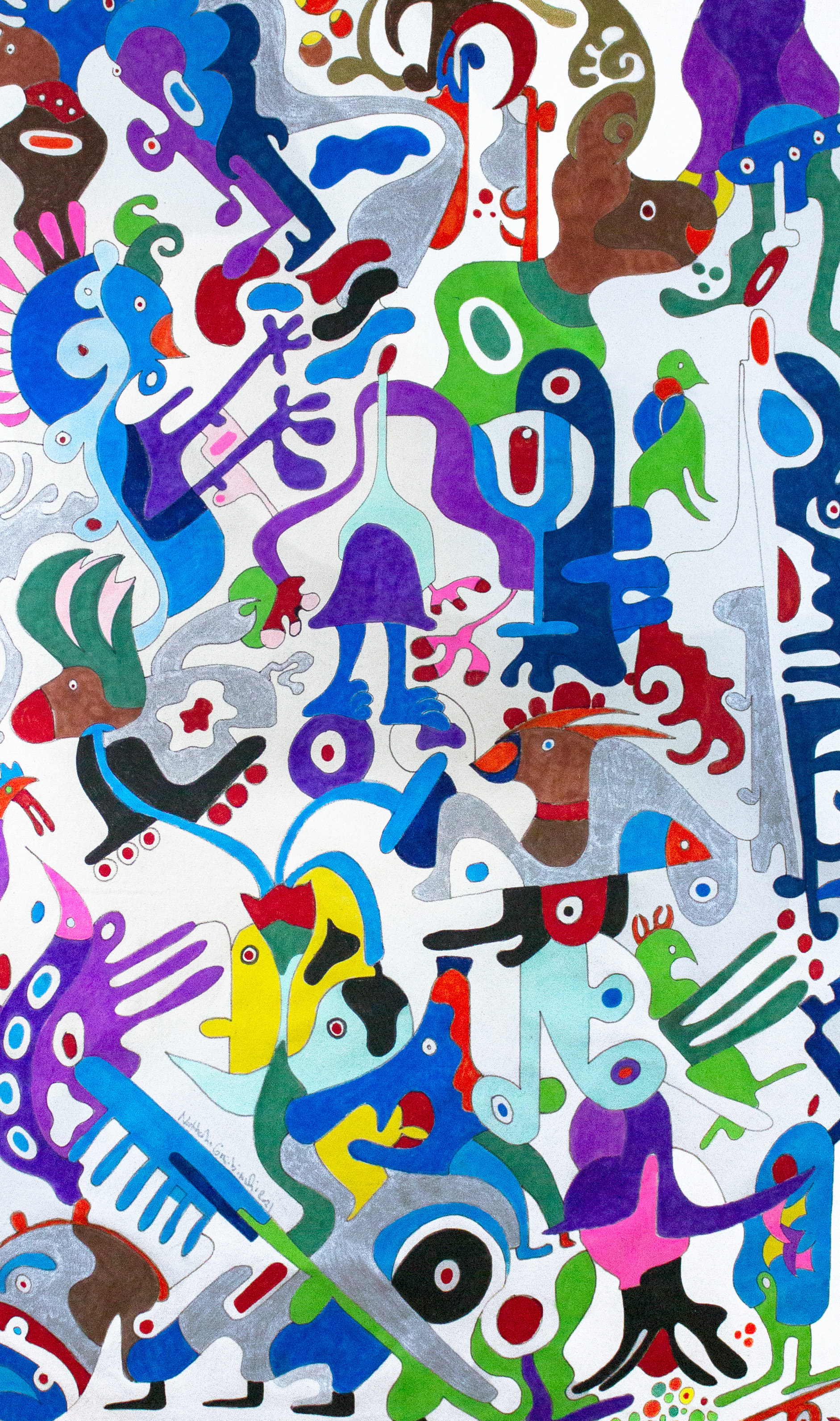 This collection reveals a vivid journey through abstraction, rhythm, and imagination. Each painting becomes a world of its own—teeming with whimsical creatures, fluid forms, and pulsating colors. Nathalie Gribinski draws from her “Tourlicoulis” spirit, creating compositions that blur the boundaries between play and mystery, dream and reality. Figures and symbols emerge from vibrant lines, as if in constant motion, inviting viewers into a dance of discovery.