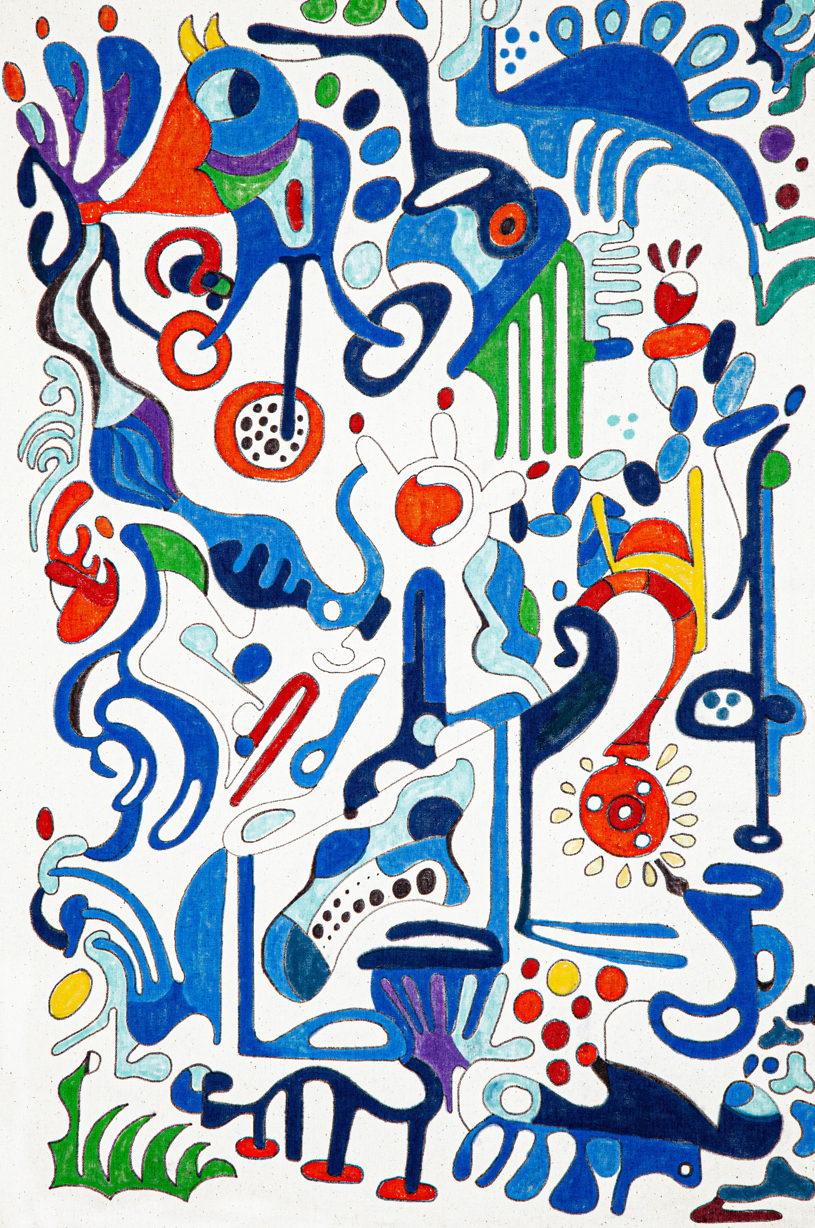 “Garden of Evasion” evokes a surreal, dreamlike landscape where abstract figures and organic shapes intertwine like hidden life in a secret garden. With its bold interplay of blues, reds, greens, and gold, the painting radiates both harmony and a sense of mystery. Flowing lines suggest growth and movement, while whimsical forms hint at creatures and flora in a state of constant transformation. Nathalie Gribinski creates a space of escape — a vibrant refuge where imagination blossoms without boundaries.