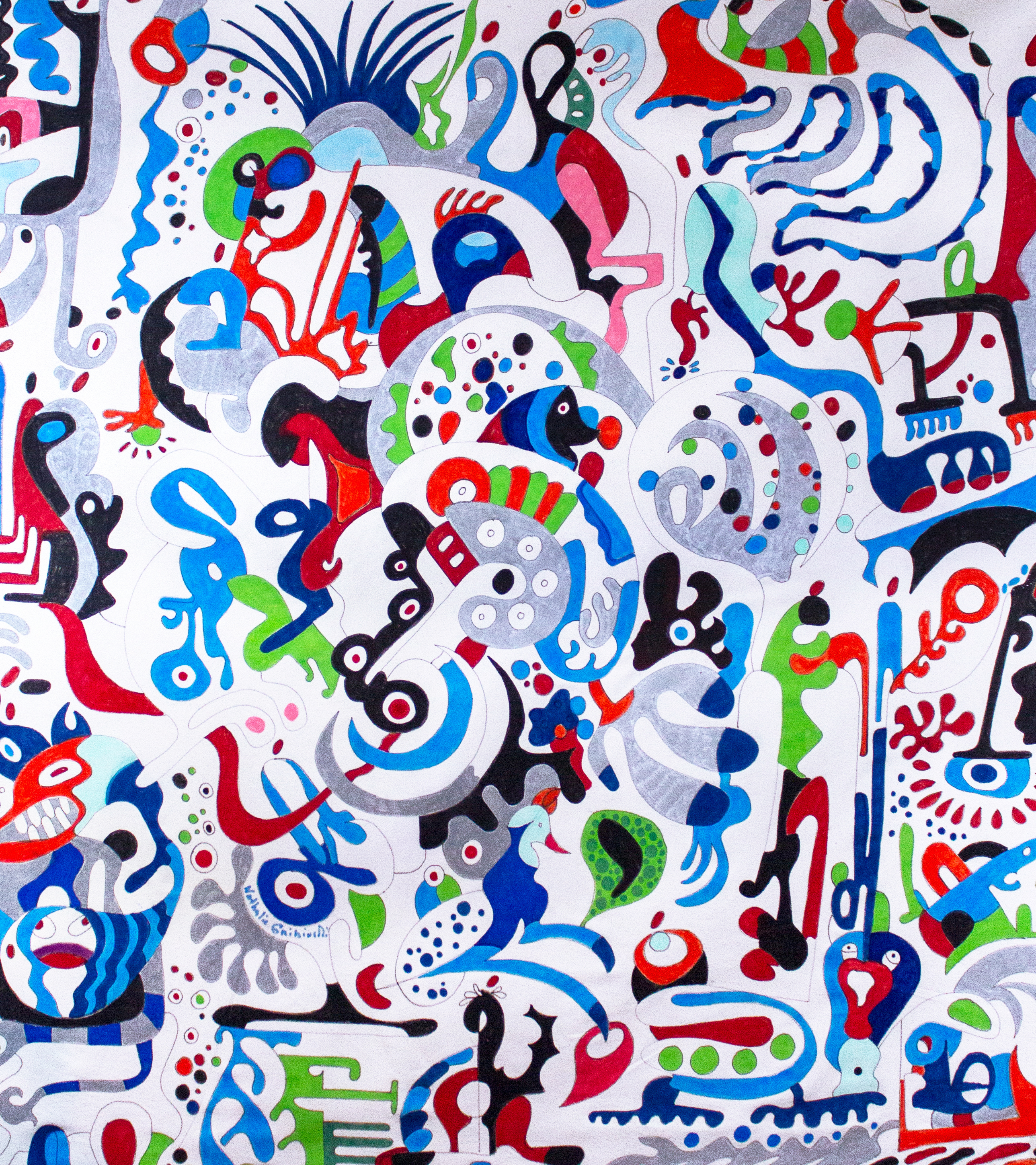Extravagant Dance” is a dynamic celebration of abundance and rhythm, where layered forms, vibrant hues, and playful motifs converge into a dazzling composition. Figures, creatures, and abstract shapes overlap in a whirlwind of energy, reflecting both chaos and harmony. With bold contrasts of red, blue, green, and black against a luminous white ground, Nathalie Gribinski transforms the canvas into a vivid spectacle, inviting viewers to revel in the richness of imagination and excess.
