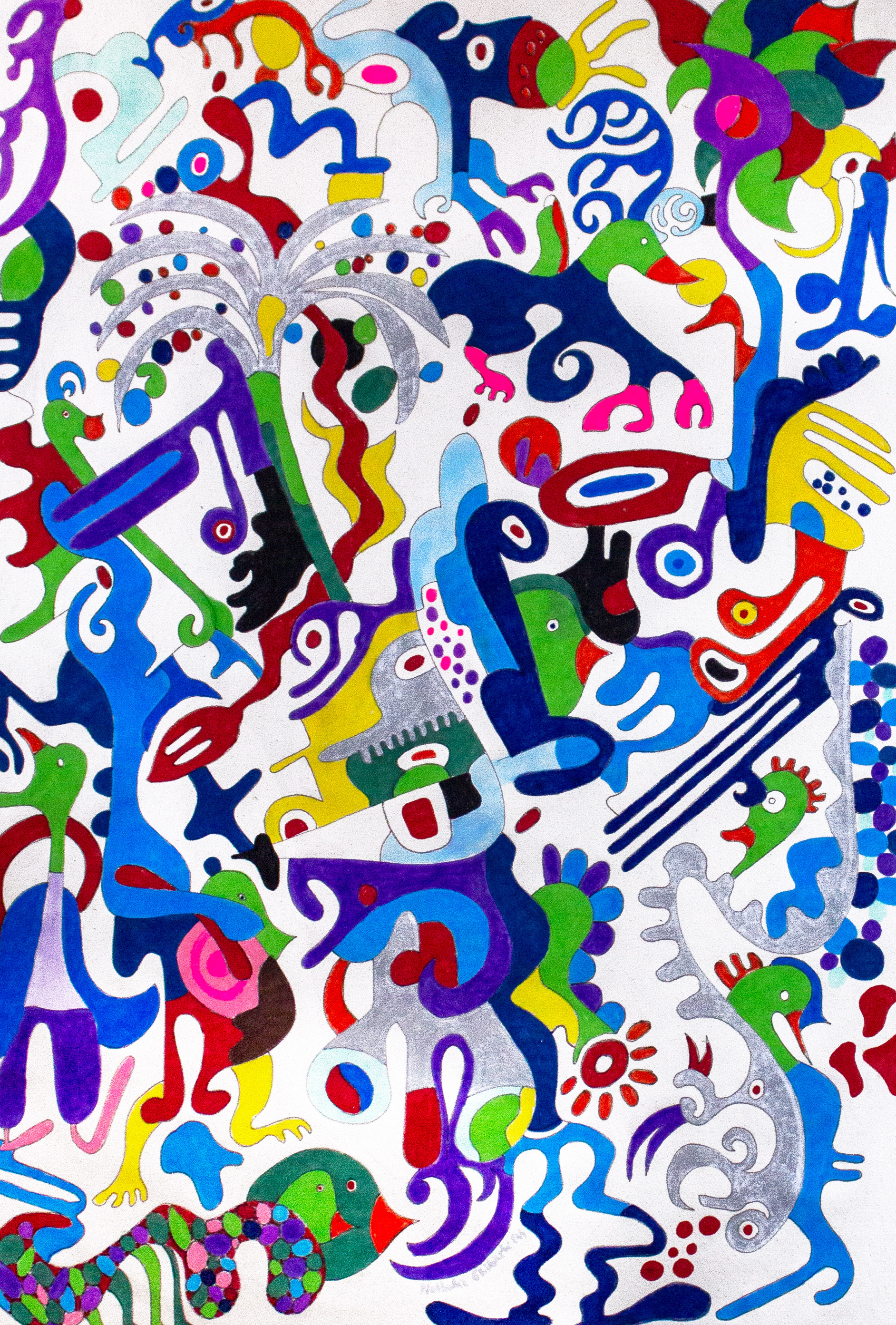 “Silver Tree” is a celebration of growth and vitality, where a radiant silver tree rises from a sea of whimsical figures and fantastical creatures. Bright greens, blues, purples, and reds orbit around the shimmering trunk, creating a symphony of movement and color. Both playful and profound, the painting evokes renewal and interconnectedness—hallmarks of Nathalie Gribinski’s lyrical abstraction, where imagination and nature merge in a vibrant dreamscape.