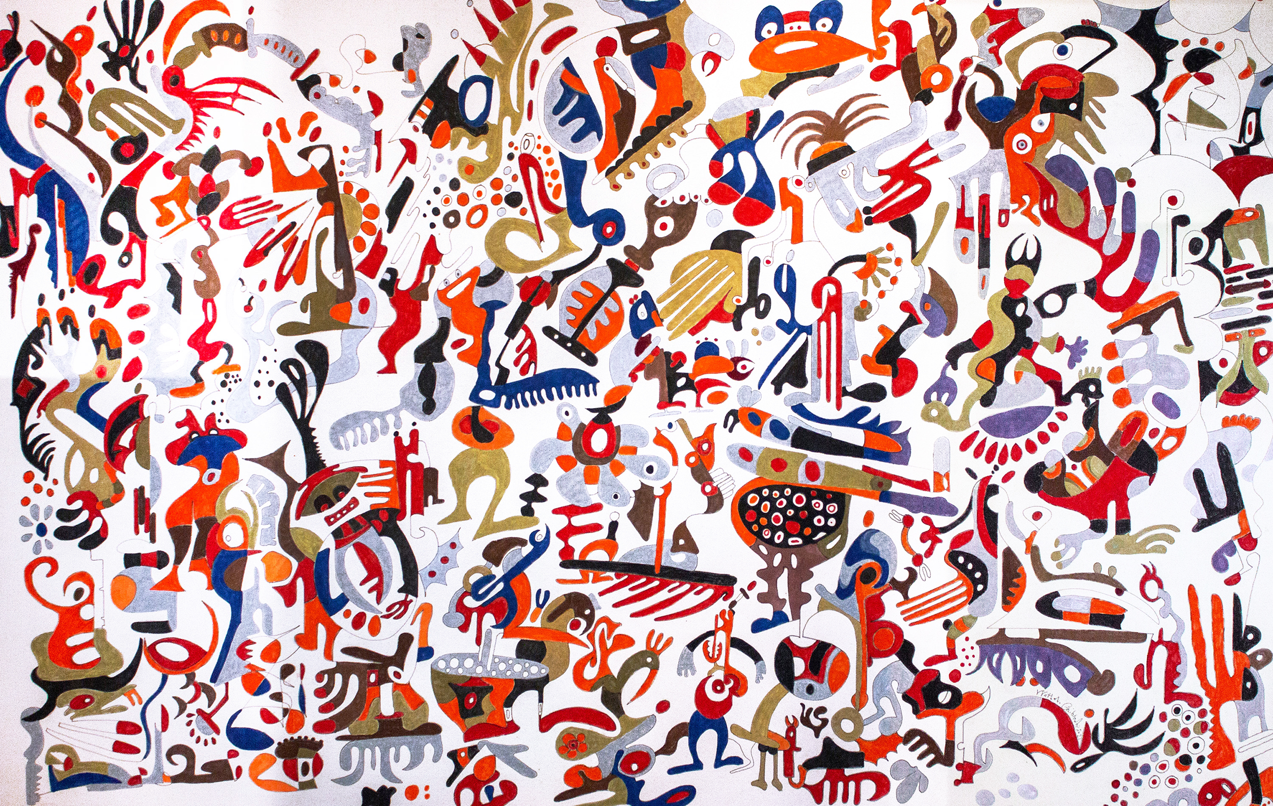 “The Theater of Dreams” unfolds like a vibrant stage where colors, forms, and symbols perform in rhythmic harmony. Figures, animals, and abstract shapes intertwine in a kaleidoscope of motion, evoking both playfulness and mystery. The layered composition invites viewers to explore an imaginative world where reality and fantasy merge. Nathalie Gribinski’s bold palette and fluid lines turn the canvas into a dreamlike spectacle, celebrating creativity as a living theater.