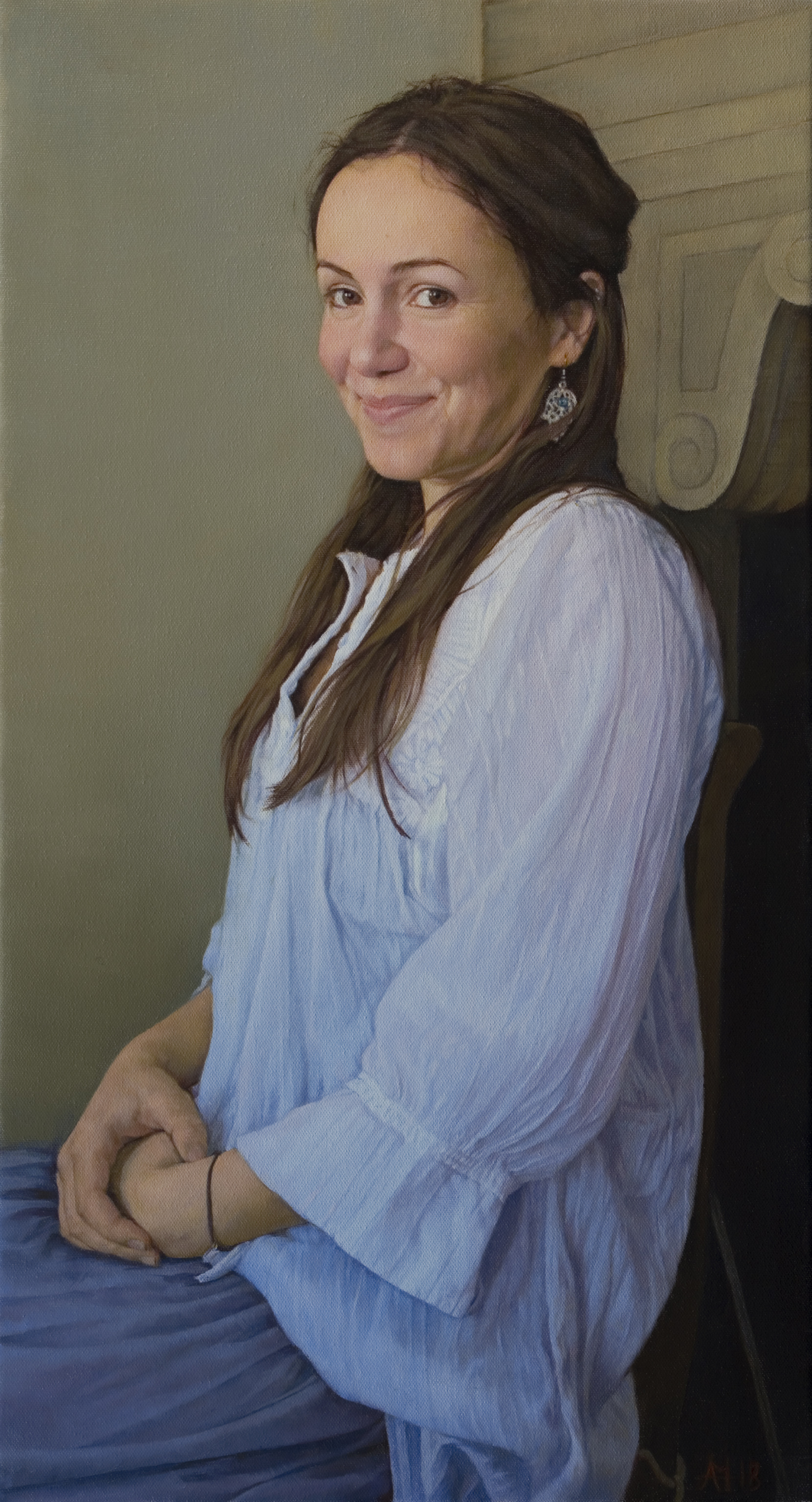 “In this portrait of my daughter, I wanted to capture a moment of serene intimacy, where her personality reveals itself through a faint, knowing smile and a gentle, complicit gaze. My aim was to preserve on the canvas not only her features but also her affectionate, spontaneous essence, within a warm and welcoming atmosphere. I hope that those who view this painting will feel a sense of quiet closeness, as if, for an instant, they too could share in that tender family moment. The soft light, the harmonious tones, and her relaxed pose all work together to convey peace and serenity, inviting the viewer to step into this intimate space.”