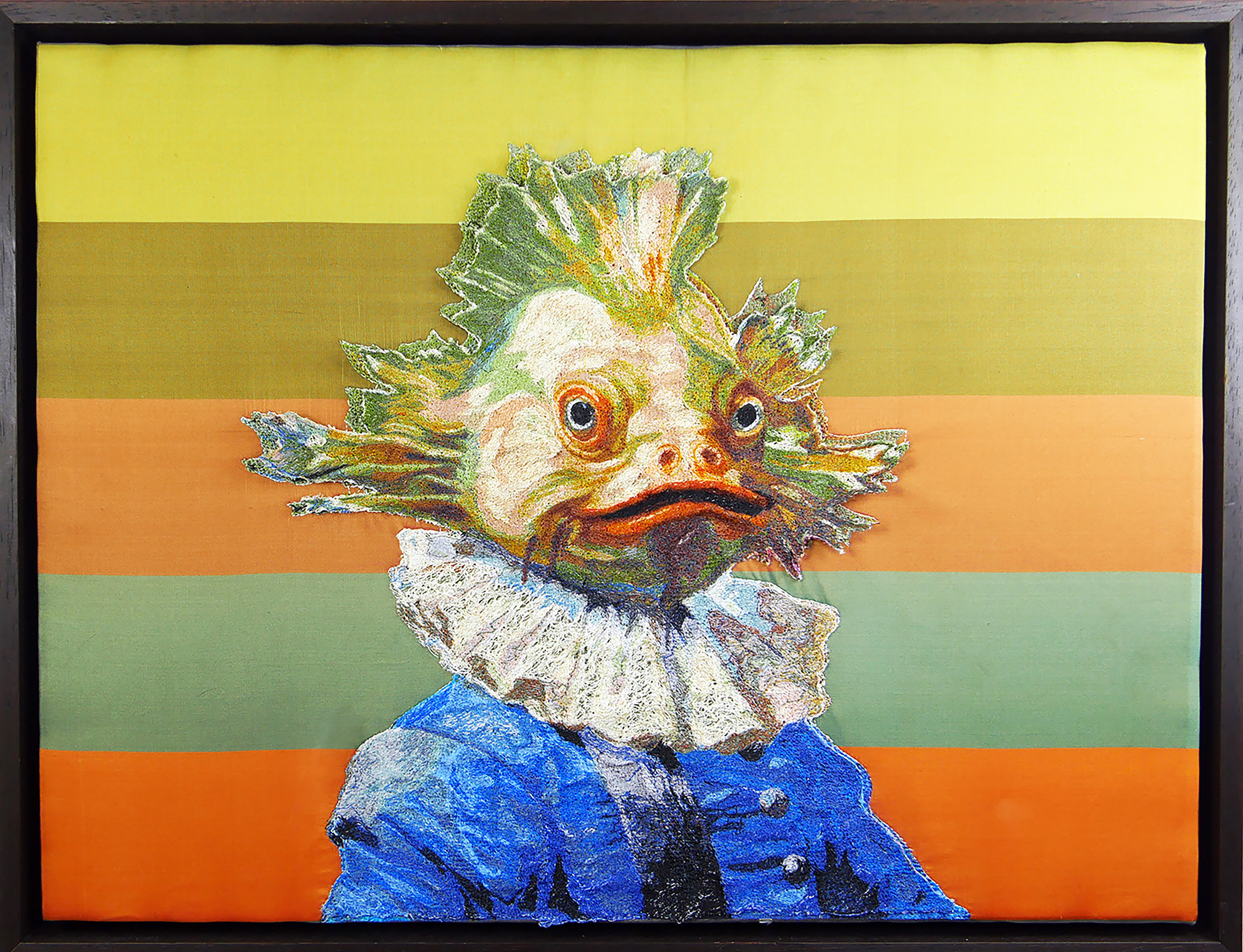 Embroidery on Silk - In the late 1600s, a notorious figure known simply as "The Marquis" held sway over the high seas and noble courts alike. Born to both the nobility and the ocean’s depths. His life was a scandalous blend of decadence and debauchery, filled with high-stakes gambling, raucous champagne-fueled gatherings, and bawdy limericks that had a way of leaving his audiences both shocked and charmed. This eccentric Marquis was a regular at every dimly lit tavern and opulent salon, always spinning tales of exploits about his beloved ship, the HMS Piscaria. Manned by fish-like sailors of fierce loyalty and stranger origins, the Piscaria roamed the seas in pursuit of treasure and revelry. Together, this strange, seaworthy crew painted the coasts in hues of salt and scandal, leaving legends of their daring escapades whispered in every port.