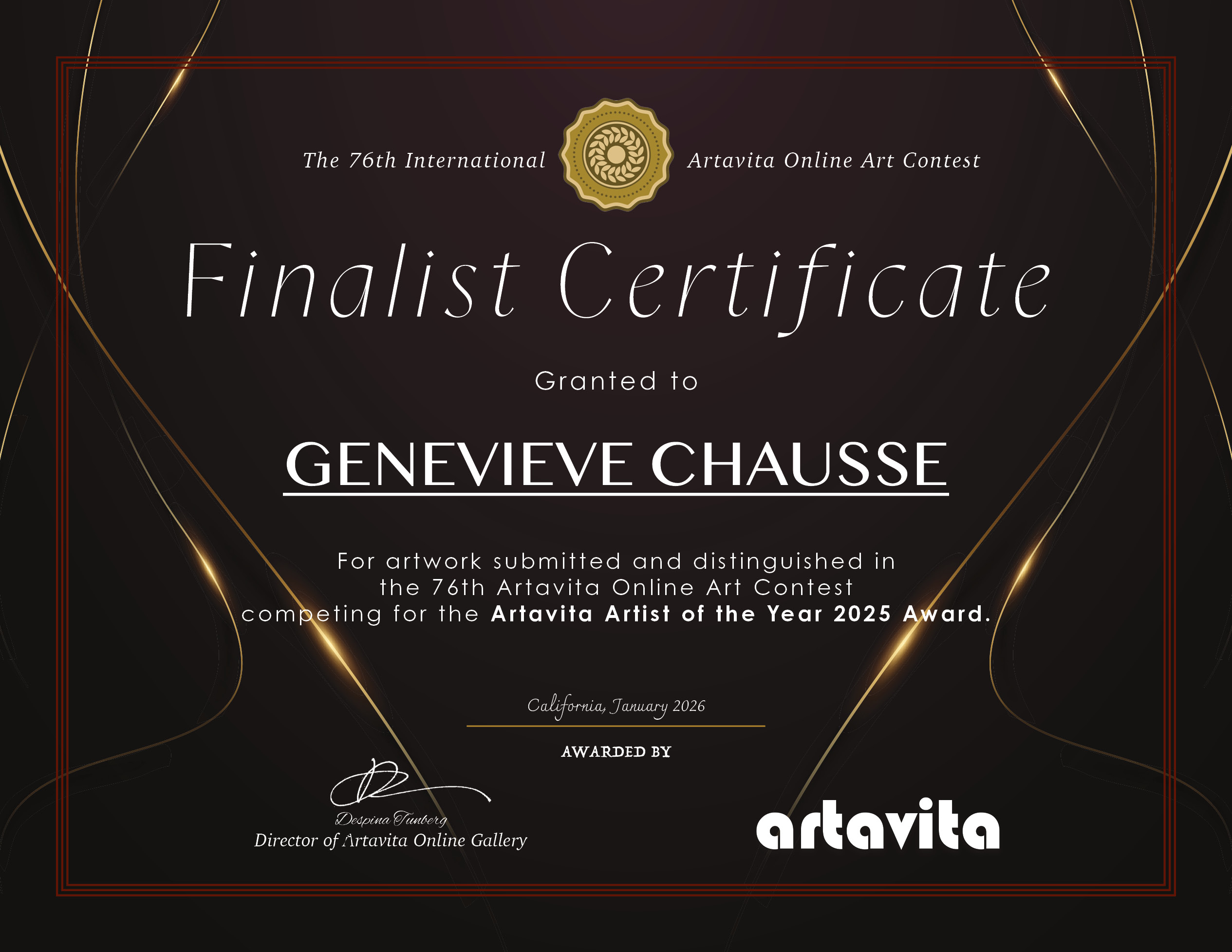 Finalist Certificate for the 76th International Artavita Online Art Contest for the Artist of the Year 2025 Award.