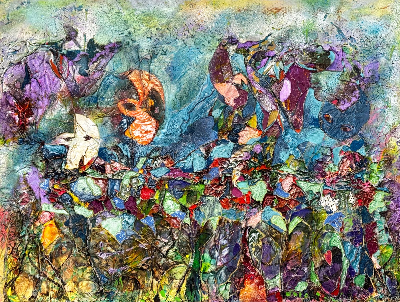 Built on canvas with a base of aluminum foil and plaster of Paris, layered with ink, spray paint, acrylic, and Pebeo Prisma colors, this work evokes the energy and mystery of a masquerade ball. In a contemporary abstract style, it explores identity as both performance and concealment, where masks shimmer, distort, and reveal simultaneously.